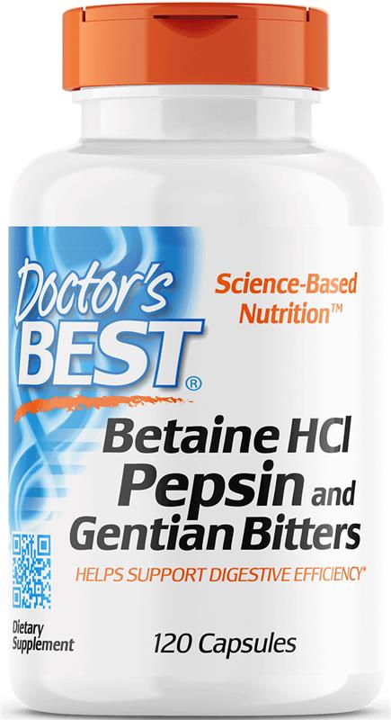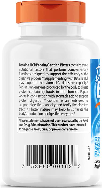 Doctor's Best Betaine HCl Pepsin & Gentian Bitters may support the stomach's digestive capacity and optimizes digestive efficiency. Betaine HCl may support the stomach's digestive capacity by decreasing gastric pH. Pepsin is an enzyme produced by the body to digest protein-containing foods in the stomach. Pepsin works in conjunction with stomach acid to support protein digestion. Gentian is an herb used to optimize the digestive capacity. Its bitter nature may help to stimulate the body's production of digestive enzymes.